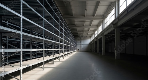 Fototapeta premium Vast interior of a warehouse with empty shelves, bathed in natural light industrial space prepared