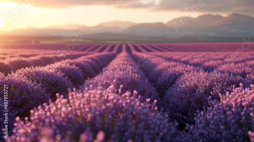 Fototapeta premium Vast lavender fields at sunset in Provence, France. A scenic view of rows of fragrant purple blooms under a golden sky, perfect for nature and relaxation themes.