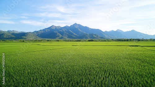 Fototapeta premium Vast lush green rice fields stretch across the landscape with green mountains...