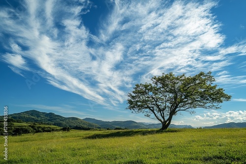 Fototapeta premium Vast meadow, lone tree, vibrant sky