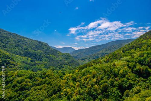 © Miroslav, Obraz premium Vast mountain valley covered in lush green forest under a sunny blue sky