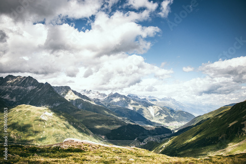 Obraz premium Vast Mountain Valley under Partly Cloudy Sky, Graubünden, Switzerland, Alps