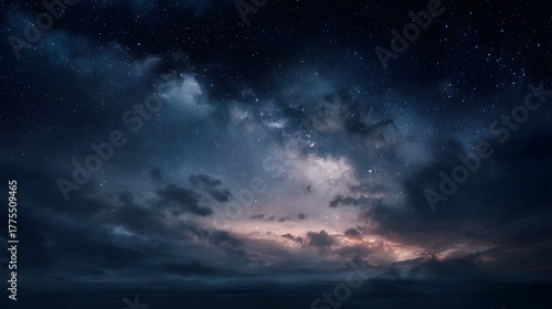 Fototapeta premium Vast night sky filled with stars and luminous cosmic clouds illuminated by twilight hues