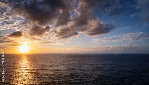 Naklejka premium Vast Ocean Expanse Under A Cloudy Sky At Dawn With A Hint Of Golden Sunlight...