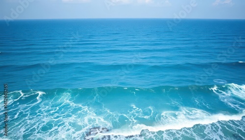 Fototapeta premium Vast ocean panorama, endless horizon, blue waves crashing on shore, horizon,...