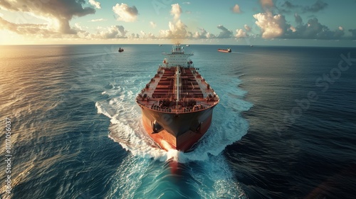 © BrightWhite, Fototapeta premium Vast ocean scene featuring large cargo ship sailing smoothly, waves splashing against hull, under beautiful sunset sky, transporting goods across tranquil blue waters.
