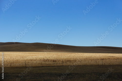 © Pan, Fototapeta premium Vast open field under clear blue sky with rolling hills