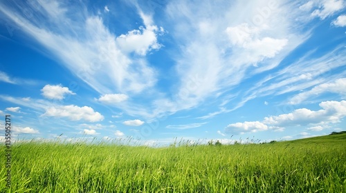 Obraz premium Vast Open Field with Lush Green Grass Under Bright Blue Sky Filled with...