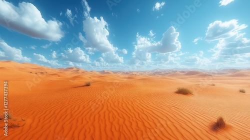 Naklejka premium Vast orange desert landscape under a vibrant blue sky with fluffy white clouds.
