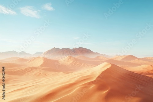 Naklejka premium Vast, orange sand dunes stretch towards hazy mountains under a clear, light...