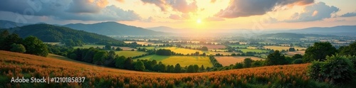 Naklejka premium Vast patchwork of fields and forests under a swirling atmosphere , forest,...