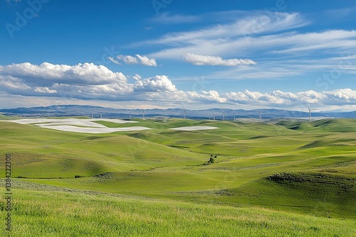 Fototapeta premium Vast Prairie Landscape Under a Bright Blue Sky with Distant Industrial...