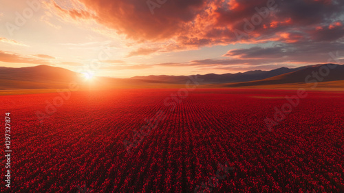 © Ariyl, Fototapeta premium Vast Red Flower Field Under a Stunning Sunset Sky with Mountains in the Distance