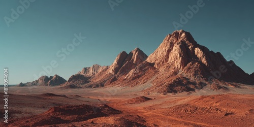 Naklejka premium Vast, red-toned desert landscape with rugged mountains under a clear, blue sky
