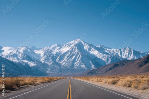 © Maria, Naklejka premium Vast road stretches towards majestic snow-capped mountains under