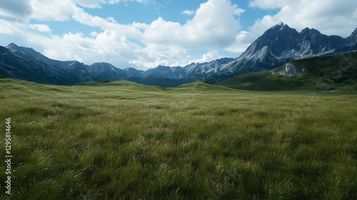 Fototapeta premium Vast Rocky Mountain Landscape with Lush Green Grass Under a Bright Blue Sky :...