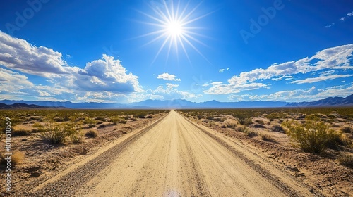 Naklejka premium vast sandy desert landscape showcasing a hot, dusty road path under a bright sun, evoking a sense of adventure and exploration in the sweeping arizona wilderness