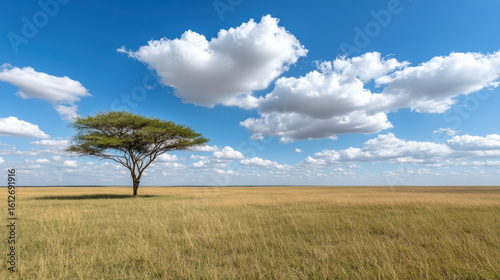 Obraz premium Vast savanna landscape features solitary tree bright blue sky filled with...