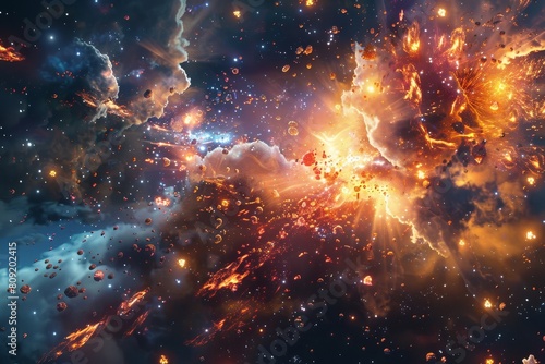 Naklejka premium Vast space filled with numerous stars and colorful cosmic explosions, A cosmic backdrop with colorful explosions and cosmic dust clouds