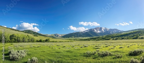 © Lala, Fototapeta premium Vast spring green landscape with lush meadows and scattered shrubs under a bright blue sky and soft cloud formations in the background.