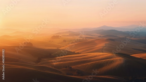 Fototapeta premium Vast undulating countryside terrain glows warmly under a hazy sunset,...
