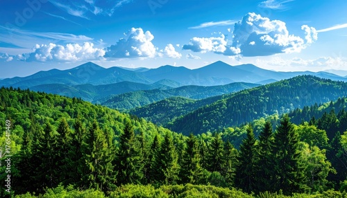 © nurul, Naklejka premium Vast Verdant Mountain Range Under a Brilliant Blue Sky with Puffy White Clouds Illuminated by Bright Sunlight