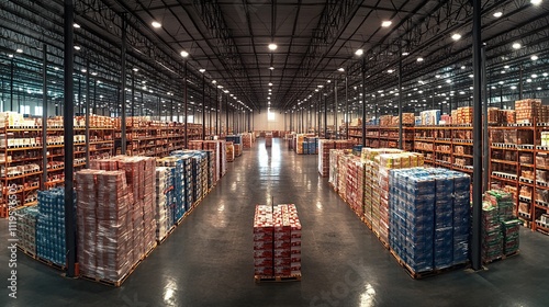 Obraz premium Vast warehouse interior with stacked pallets of goods, showcasing efficient...