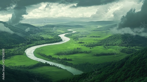 © ArtificialHorizons, Fototapeta premium Vast winding river flowing through lush green valley surrounded by mountains under dramatic cloudy sky Copy Space