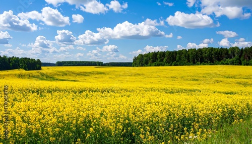 © Alwi, Fototapeta premium Vast yellow field under a partly cloudy sky (1)