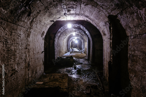 Fototapeta premium Vaulted tunnel with concrete walls in old abandoned bunker, mine, drainage,...
