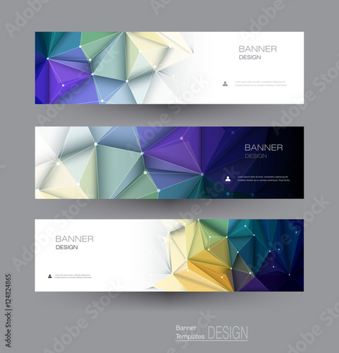 © nongkran_ch, Fototapeta premium Vector abstract banners set with polygonal, Triangle pattern shape and molecule structure. Low poly banner with connecting dots and lines. Polygon vector background for web banner template or brochure
