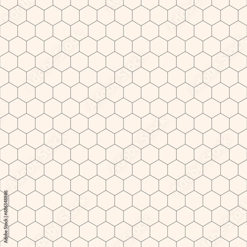 © Olgastocker, Naklejka premium Vector abstract seamless geometric pattern. Subtle minimalist design with hexagonal shapes, linear grid, honeycomb. Simple minimal black and white background texture. Repeat design for decor, print