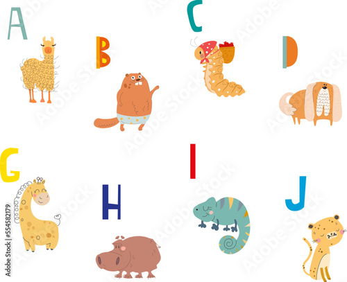 Fototapeta premium Vector alphabet with animals in cartoon style. Part 1.
