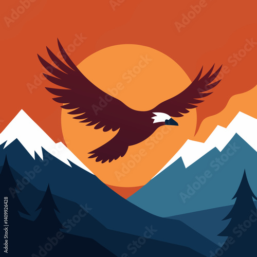 © Dipok, Obraz premium Vector art illustration of an eagle flying in the sky over a mountain