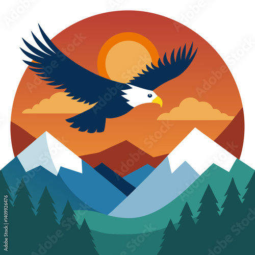 © Dipok, Obraz premium Vector art illustration of an eagle flying in the sky over a mountain