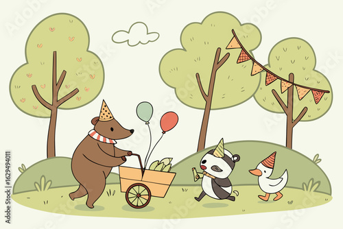 © Foysal, Naklejka premium Vector art of a cheerful bear and friends celebrate a birthday in the forest with balloons and gifts in this cute vector illustration