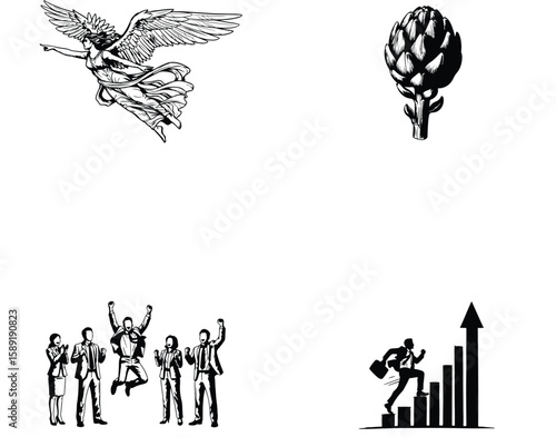 © abid_gfx1, Naklejka premium Vector art of a winged angel flies above a celebrating business team and a growth chart