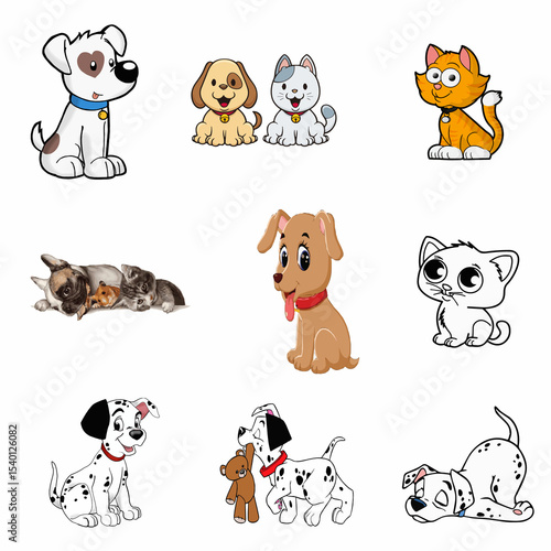 Fototapeta premium Vector art of adorable puppies and kittens, playfully interacting, isolated...