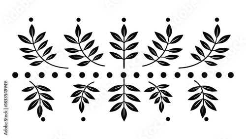 © polash27, Fototapeta premium Vector art of black and white botanical border with leaves and dots, isolated on white background.
