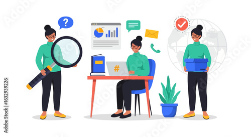 © Mst, Obraz premium Vector art of businesswoman analyzing data with magnifying glass, working on laptop at desk, and holding basket, isolated on white background