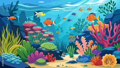 © laxmidesign, Naklejka premium Vector art of colorful underwater scene showcasing vibrant coral reefs, diverse fish species, and sunlit waters, depicting a thriving marine ecosystem illustration
