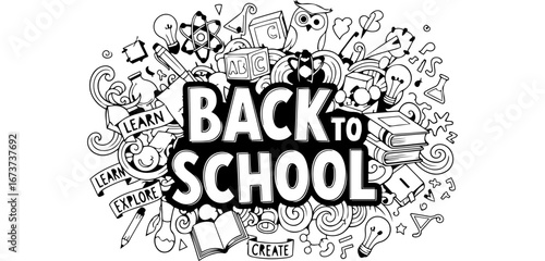 © MSTLIPE, Fototapeta premium Vector art of creative backtoschool doodle art with educational icons and text