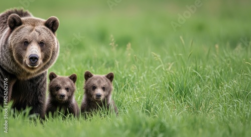 © Laboni, Fototapeta premium Vector art of grizzly bear mother with two cubs in a grassy meadow