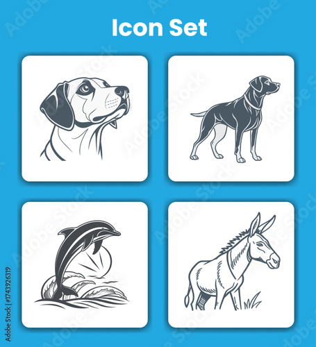 Obraz premium Vector art of icon set featuring a dog, a dolphin, and a donkey