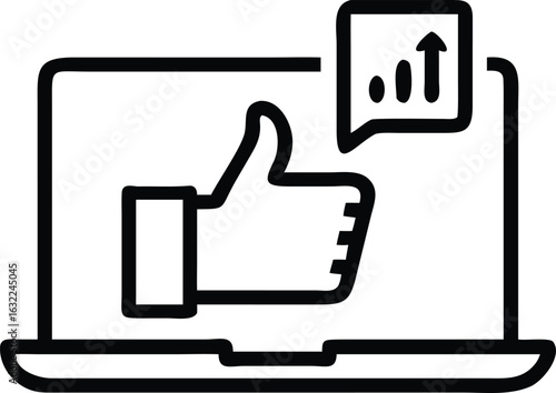 Fototapeta premium Vector art of laptop computer screen showing a thumbs up and a positive growth chart, isolated on white background