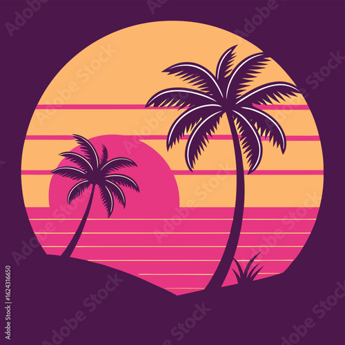 © MDNUR, Naklejka premium Vector art of retro sunset with palm trees on a tropical beach in vintage style