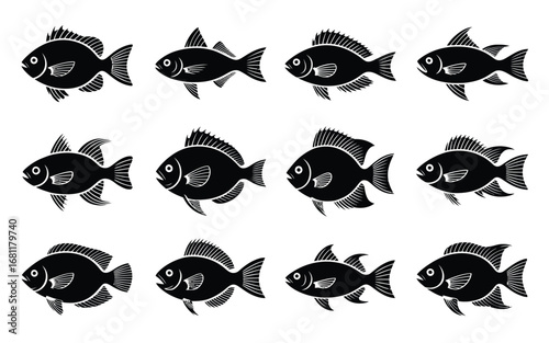 © loveley0190, Naklejka premium Vector art of set of silhouette vector illustrations of various fish species, representing marine life, aquatic animals, and underwater ecosystems