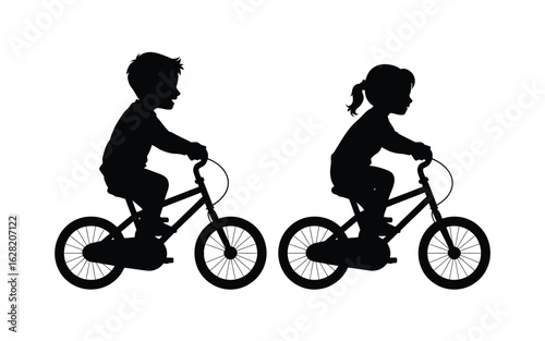 Fototapeta premium Vector art of silhouette of a boy and girl riding bicycles, isolated on white background