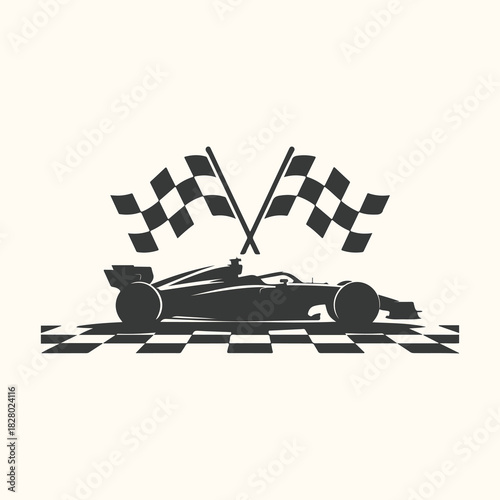 © mt graph, Obraz premium Vector art of silhouette of a formula 1 race car with checkered flags and a checkered finish line, representing speed and victory in motorsport