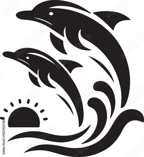 © Suma Creative, Naklejka premium Vector art of silhouette of two dolphins jumping out of the water isolated on white background